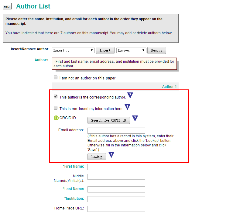 各位大师:求助了。我投稿的时候填写作者这儿一直不对,不知道啥问题。图中要申请个ORCID,我也用导师的邮箱申请了,但下面的lookup就说邮箱找不到。对了,我用自己的邮箱注册的JEB的投稿账户,没有影响吧?上面的第一行insert remove是啥意思噢。万能的虫友,求帮忙噢。多谢咯 2015-11-30_215126.gif |
