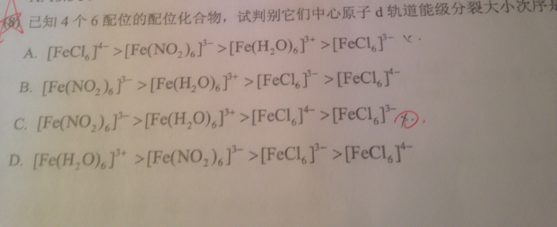 选B。配体场强度:NO2->H2O>Cl-,同种元素中心离子,价态越高,分裂能越大。