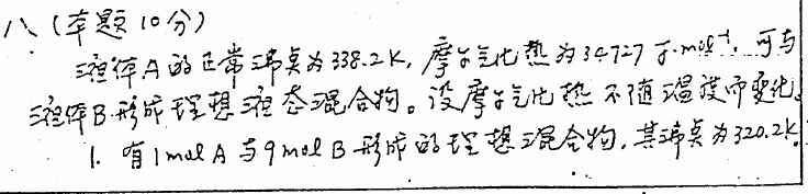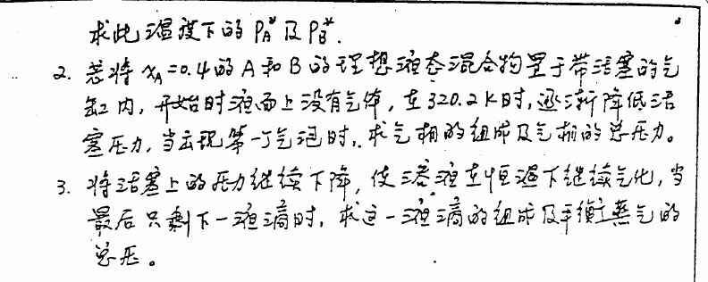 £¨1£©¸ù¾ÝÌâ¸ÉÏÈÐè¾Ý¿Ë-¿Ë·½³Ì¼ÆËãAÔÚ320.2KʱµÄp*(A)=50.44kPa p=p(A)+p(B)=101=0.1p*(A)+0.9p*(B)=5.044+0.9p*(B) p*(B)=106.62kPa (2)x(A)=0.4 p=p(A)+p(B)=0.4p*(A)+0.6p*(B)=84.15kPa y(A)=p(A)/p=0.24 y(B)=1-0.24=0.76 (3)y(A)=0.4 y(B)=0.6 y(A)/y(B)=p(A)/p(B)=x(A)P*(A)/(1-x(A))P*(B)=0.4/0.6=2/3 X(A)=0.58 X(B)=0.41 p=p(A)+p(B)=0.58p*(A)+0.42p*(B)=74.04kPa |