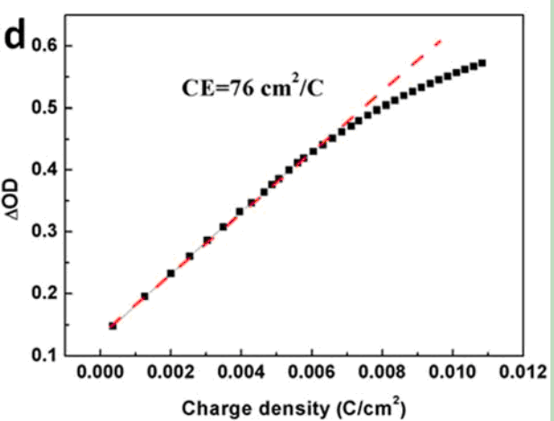 这是用电致变色的原位测试做出来的,即电化学工作站与UV-VIS分光光度计联用测试。着色效率CE=△OD /△Q,△OD=log(Tb/Tc).,从分光光度计上可以读取到变色前后的透过率,即得到了△OD=log(Tb/Tc),然后电化学工作站上 ...