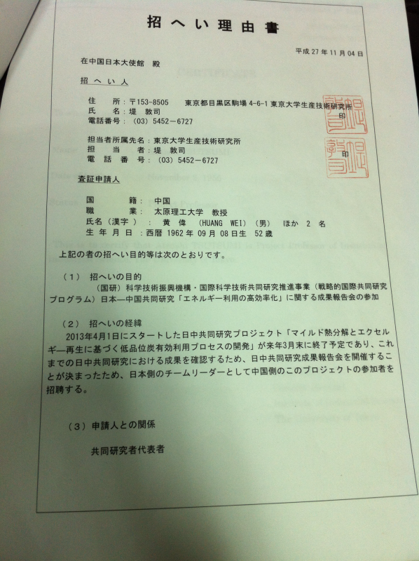 邀请理由书 平城27年11月4日 尊敬的中国大使馆 邀请人 住所:〒 153-8505 姓名:堤 敦司 电话号码: 担保人所属单位: 担保人:堤 敦司 签证申请人 国籍:中国 职业:太原理工大学 教授 姓名:黄伟 男 其他 2名 年龄: 上述的人的邀请目的等如下: (1) 邀请目的 (国研)国家科学技术振兴机构-国家际科学技术共同研究推进事业(政府间国际合作项目)日-中共同研究《能源利用高效化》相关的成果报告会参加 (2) 邀请行程 2013年4月1日新闻报道的日中共同研究项目《基于温和热解的低阶煤高效分级利用关键技术开发》到明年3月底预定项目完成,以往的日中共同研究成果的确认、参加中日共同研究成果报告会。由于日方不能成行,特邀请中国方面的项目人员参加。 (3) 申请人的关系 项目合作人员 |