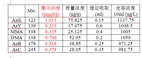亚砷酸根 1.011μmol/g 砷酸根 0.233μmol/g 一甲基砷酸 0.335μmol/g 二甲基砷酸 0.706μmol/g 砷甜菜碱 0.518μmol/g 砷胆碱 0.374μmol/g 以上标品均是从阿拉丁购买,现在要配成1000ug/L的混合标准溶液,怎么配置啊,急急急! |