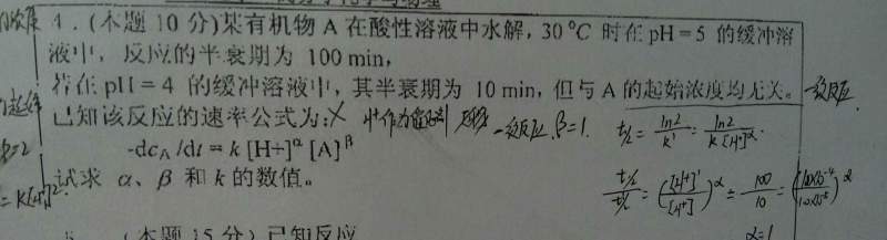 利用对A为一级的半衰期公式,解得反应对H+的级数也为一级