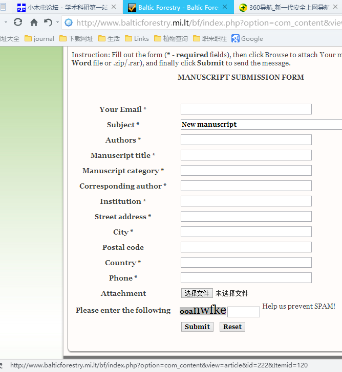 各位大侠请指教,写了一篇关于林药复合种植的英文文章,用了红外和液相,刚刚被拒于Spectroscopy Letters(IF=0.8),现在想找个农林方面的期刊试试,恳请各位大神帮忙推荐下!谢谢! 另请教下,https://www.balticforestry.mi.lt/bf/#opennewwindow这个主页会不会是baltic forestry 期刊的钓鱼网站,近视因为其投稿处长这样。好像不需要注册的样子,担心投上去就是钓鱼网站的话,啥都看不见了,,,,求各位大侠的宝贵意见,谢谢! QQ图片20151203094921.png |