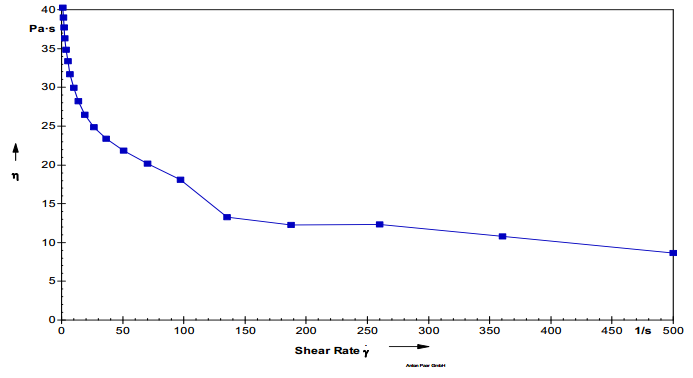 两幅图均表现出明显的剪切稀释性,表明聚合物溶液属于幂律型流体。从图1可知,溶液初始黏度70,50s-1时黏度为28左右,黏度降幅60%,从100s-1之后,黏度的降幅明显减小,趋于稳定,黏度稳定在10左右。从图2可知,溶液初始黏度41,50s-1时黏度为21左右,黏度降幅50%,从135s-1之后,黏度的降幅明显减小,趋于稳定,黏度稳定在12左右。 从初始黏度可以看出,图1所代表的聚合物溶液增黏性能较好(在两种聚合物溶液加量相同的情况下); 综合50s-1时黏度降幅、黏度稳定时的剪切速率、黏度稳定值,图2所代表的聚合物溶液抗剪切性更好。 |