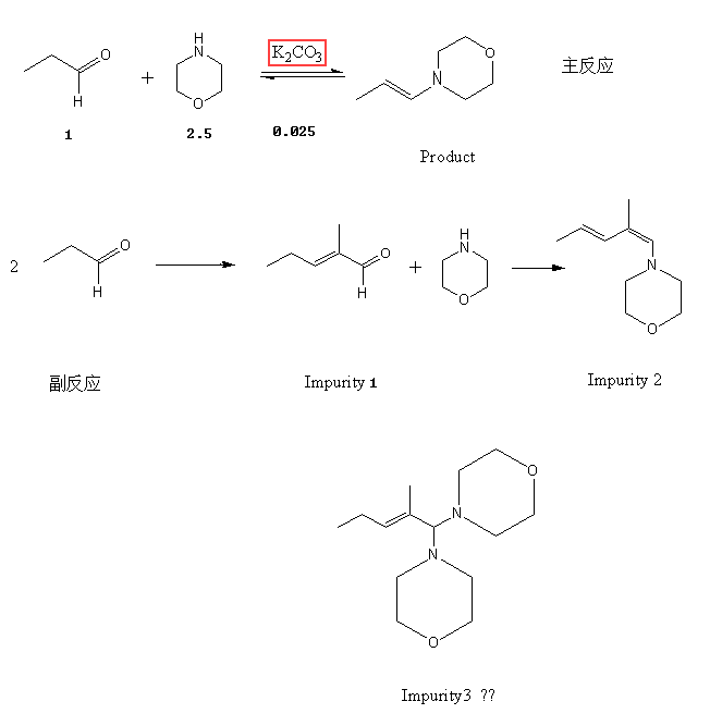 本人做的一个反应,为正丙醛和吗啉反应,温度为0-35℃,反应结束,高真空脱出水,终点温度50℃,过滤掉游离碳酸钾,母液此时GC中控正丙醛几乎无,且无明显杂质,(GC归一杂质均<0.1%),母液再高真空回收过量的吗啉,回收温度60-100℃/7mmHg,在回收结束,物料中目标产物含量约85-90%,吗啉2-10%,并出现了明显的四个杂质,GC-MS定性下来为 :正丙醛二聚合(下图杂质1,GC归一约0.5%)、杂质2(见下图,GC归一2~4%),其中还存在一个未知较大杂质(GC归一约4-5%,初步怀疑为下图中杂质3),请教下各为大侠,控制杂质1/2/3有什么好方法: