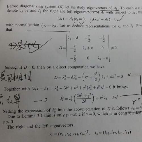 各位虫友,我想请问一下这条等式怎么来的(怎么算那个)?这里主要想推D等于0不成立,但是那条式子我不能从特征很那个方程退出来喔? 发自小木虫Android客户端 |