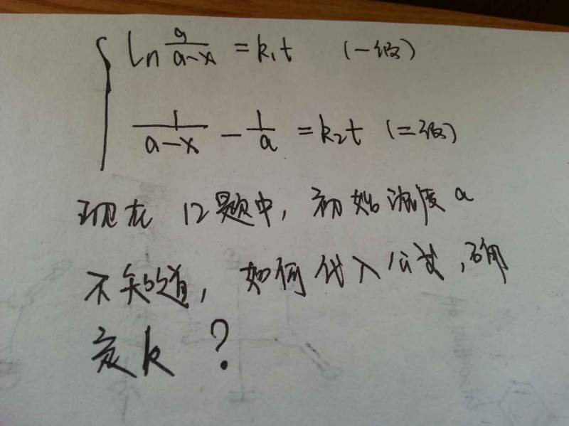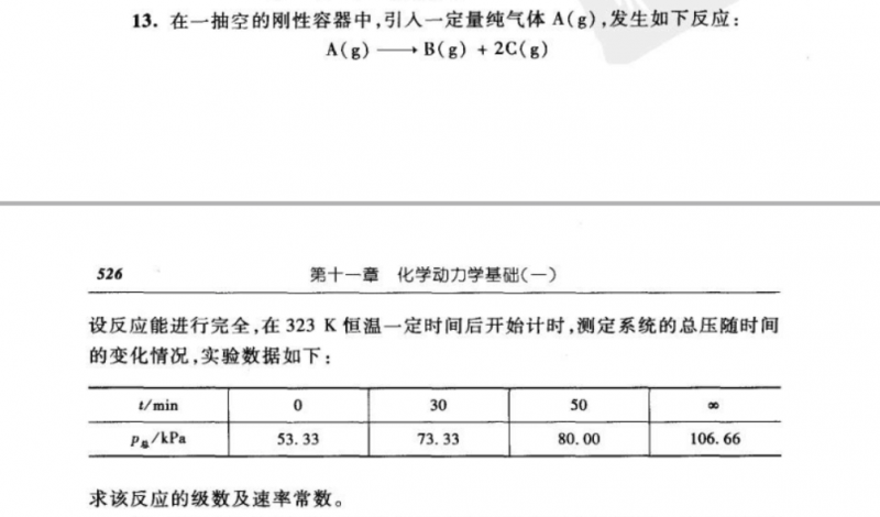 12.用定积分公式求貌似就是从一级反应一步一步忘上试,也就像书上说的尝试法,先将不同时间的相关数据代入一级反应的定积分公式中,若所求的k是常数,则就是一级反应。若不为常数,则同理代入二级反应的定积分公式中,若为常数,则就是二级反应。像这样的题目,既然要求级数,一般不是一级就是二级吧。 13.题目所给的是时间t与P总的关系,反应速度应只与反应物浓度有关,所以要把相关数据转换成t与P(A)的关系,再同12题的方法,代入到一级反应或二级反应的定积分公式中求k。 学渣一枚,仅供参考。 发自小木虫Android客户端 |