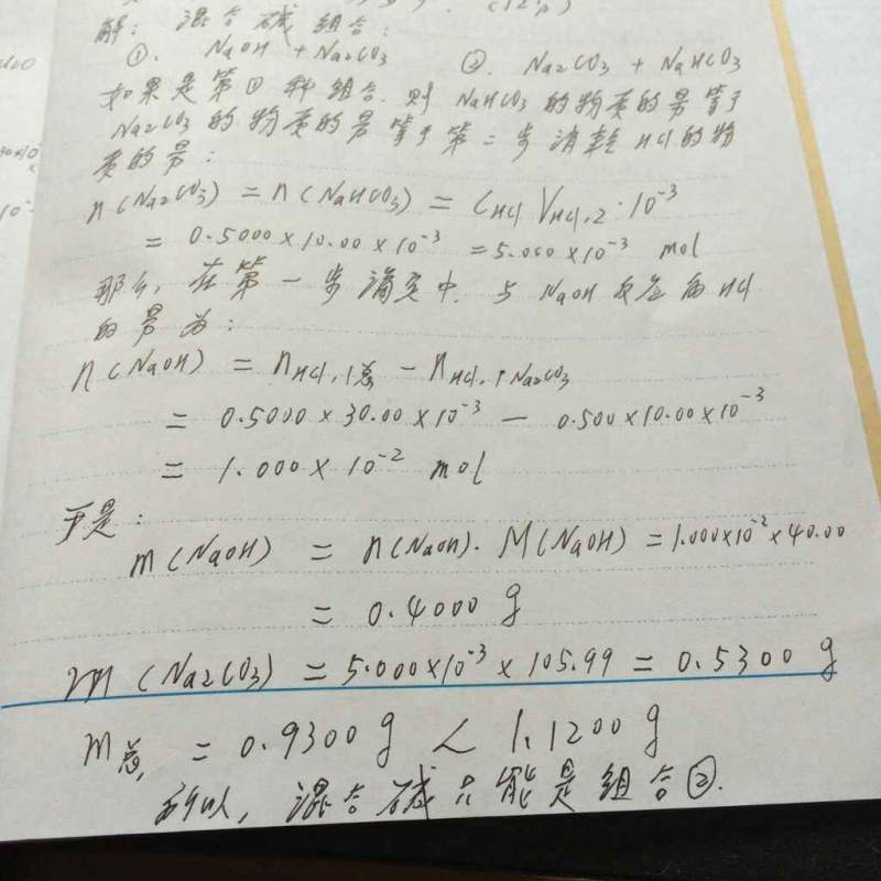 因为这个方法采用的是双指示剂测定混合碱,而且前者消耗盐酸的体积大于后者,因此该混合碱的组成是NaOH和Na2CO3的混合物。NaOH的质量分数为35.7%,Na2CO3的质量分数为47.3%。 http://wenku.baidu.com/link?url= ... aDbzKe8jL2QeWIqxBw3 这个文库有对双指示剂法的详细介绍,你可以看看 |