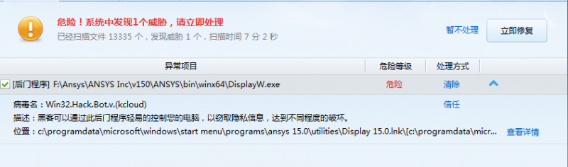 ansys安装后金山卫士杀毒后提示 有问题,如下: 已有2人参与