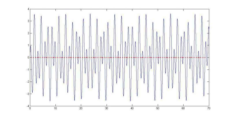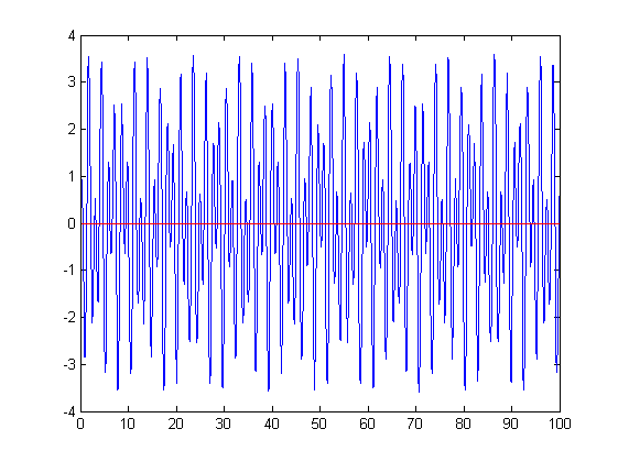 %%这是非线性方程求解,普通的solve无法求得准确的解,fsolve无法解得100个解; %%我这里用的是数值解法,精确度在为10^(-4),可改变x来提高精确度,看个人需要; %%思路:求出y=0.5*sin(3.6*x).*cos(x)+3.6*cos(3.6*x).*sin(x)=0的100个解X; %可画出其图像,很容易看出y会在解处变号!!!由此可筛选出解 x=0:0.0001:70;%间隔越小,精确度越高 y=0.5*sin(3.6*x).*cos(x)+3.6*cos(3.6*x).*sin(x);%函数 plot(x,y,'b') hold on n=1; for i=1 length(x)-1)if y(i)*y(i+1)<=0%如果小于0,知道此处y发生变号,那么此处对应的x即解 X(n)=x(i);%将找到的解赋值给另一个矩阵 n=n+1; end end X=X(2:101);%因为问题说前100个正解,不包括0 Y=0.5*sin(3.6*X).*cos(X)+3.6*cos(3.6*X).*sin(X); plot(X,Y,'.r')%画出解的点 |