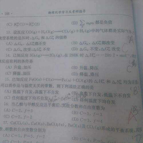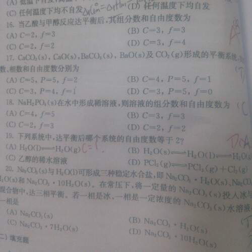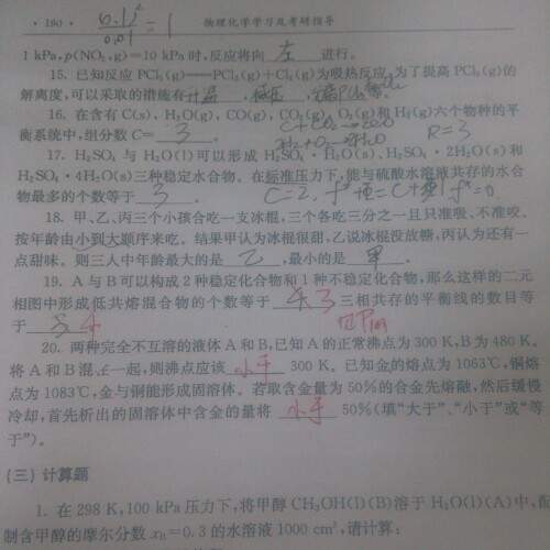 13、选C。因为标准态均为P°且满足理想气体行为的状态,所以标准吉布斯自由能变不变(标准未变),但增大压力分子间作用在增大,逸度系数发生变化,故反应的吉布斯自由能变会随之而改变。 16、选A。因乙酸乙酯和水及乙酸、乙醇混溶,就有一浓度限制条件 f=2-1+2=3。 19、选D。A:f=1-2+2=1;B:f=1-3+2=0;C:f=2-1+2=3;D:f=1-1+2=2(实际上此题不严密,只有起始只有PCl5或起始有PCl5及PCl3和Cl2浓度相同时,才存在一个浓度限制条件,才有此结论。) 19、答案:3、4. 正常情况下:每增加一个稳定化合物,增加一个低共熔点(所在的线为水平线);每增加一个不稳定化合物增加一个转熔线。 20、答案:小于(水蒸气蒸馏原理)、小于(类似气液平衡,易挥发组分在气相中的含量高于液相,同理易熔化的金属AU在液相中含量大于固相中的含量) |