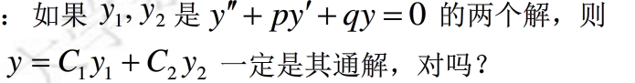 把N=y''+py'+qy看成微分算子,会发现它是线性的。那么kerN, 也就是N(x)=0的所有x,是一个线性空间,并且是二维的,取线性无关的两个解y1,y2才能表示出任意一个解。