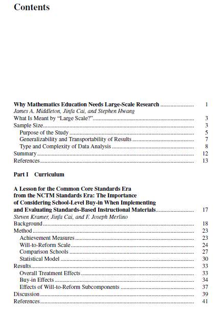 Large-Scale Studies in Mathematics Education Editors: James A. Middleton, Jinfa Cai, Stephen Hwang ISBN: 978-3-319-07715-4 (Print) 978-3-319-07716-1 (Online) |