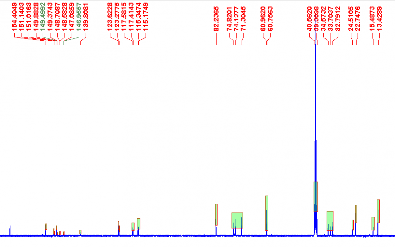 我有个含氟的化合物打了个碳谱。裂分的季碳的化学位移无法标定完全。强行标定后,在处理成图谱的时候位移值显示很奇怪。求解~~ 下附图谱两张,第一张图的绿色字体是最后强行标定的位移值,在第二张图中显示就很奇怪。 c13-1.png C13.png |