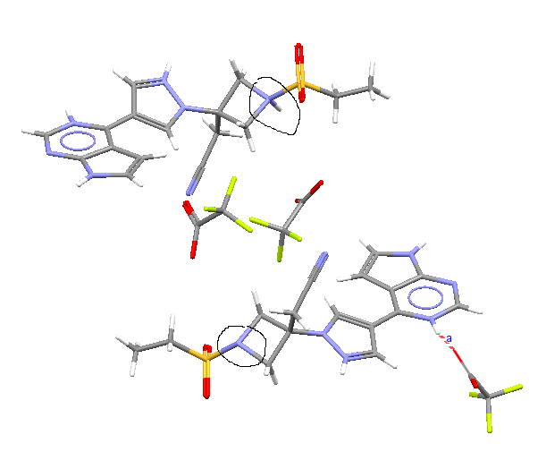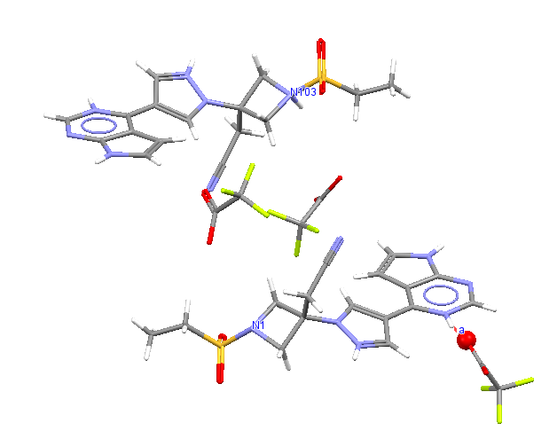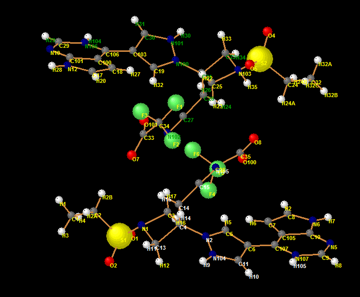 请问,我的化合物与三氟乙酸成盐了。单晶结构立体图如下,现在一个分子N103上有H,另一个分子N1上无法定H,请问怎么可以加H啊。残留电子云一直无法定位。 QNYNL0L$`$IC]9}GBRQLEY6.png W%A5Y5F[QV9G5_2Z$154835.png |