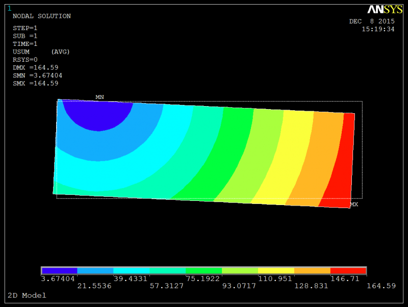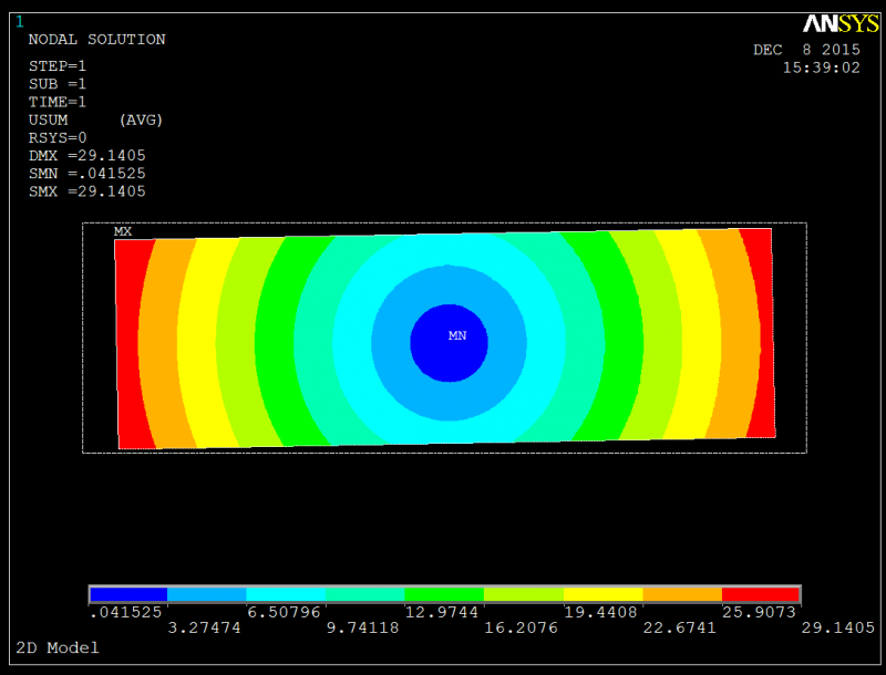 先是三角形网格命令流和结果,总位移云图结果比较符合实际情况,铜块在降温过程中是沿着X,Y方向均匀收缩的