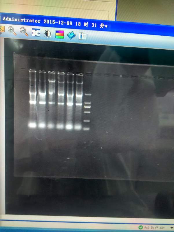 用生工的Trizol提取小鼠脑组织总RNA,1,2孔为同一个样本,3,4孔为同一个样本,5,6孔为同一样本,加的都是1ml的Trizol,1/4的小脑。结果如图,最上面有一条带,这是由于DNA污染了吗?是否可以接着用Takala家的反转录试剂盒进行反转录后以此为模板做荧光定量PCR?如果不可以我该怎样避免这个问题?初学荧光,请高人指点,感激不尽!!!
