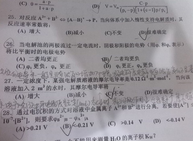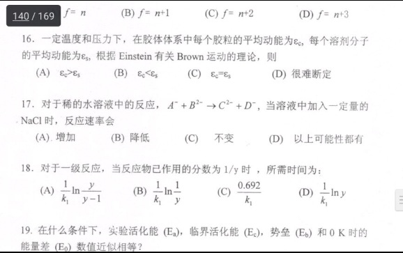 17题属于原盐效应,书上有啊,对于带同种电荷的离子间的反应,反应速率随离子强度增大而增大;对于带异种电荷的离子间的反应,反应速率随离子强度增大而减小;若反应有中性分子参与,离子强度对速率无影响 发自小木虫IOS客户端 |
