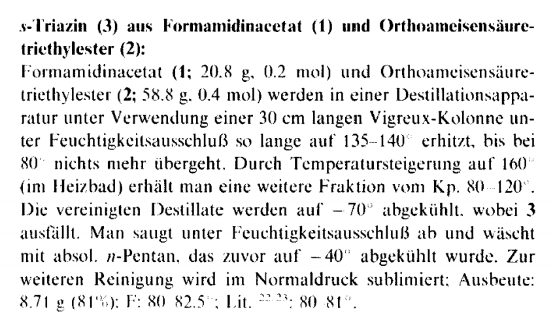 | Formamidinacetat(1;20.8g,0.2mol) und Orthoameisensäure-triethylester(2;58.8g. 0.4mol) werden in einer Destillationsapparatur unter Verwendung einer 30 cm langen Vigreux-Kolonne unter Feuchtigkeitsausschluß so lange auf 135-140° erhitzt, bis bei 80° nichts mehr übergeht. Durch Temperatursteigerung auf 160°(im Heizbad) erhält man eine weitere Fraktion vom Kp. 80-120°.Die vereinigten Destillate werden auf -70° abgekühlt. Wobei 3 ausfällt. Man saugt unter Feuchtigkeitsausschluß ab und wäscht mit absol. n-Pentan, das zuvor auf -40° abgekühlt wurde. Zur weiteren Reinigung wird im Normaldruck sublimiert; |