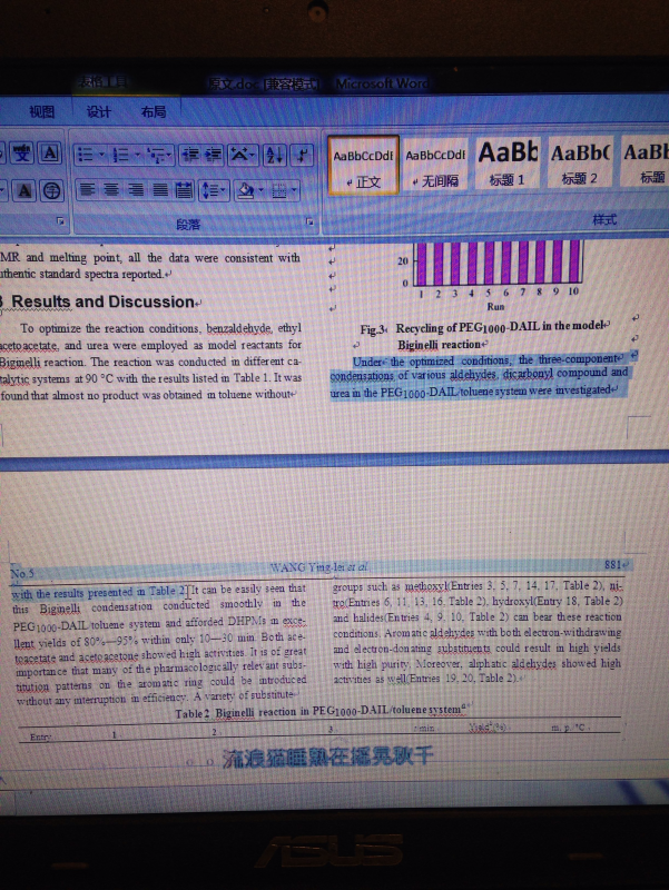 Under the optimized conditions, the three-component condensations of various aldehydes, dicarbonyl compound and urea in the PEG1000-DAIL/toluene system were investigated with the results presented in Table 2. 发自小木虫IOS客户端 |