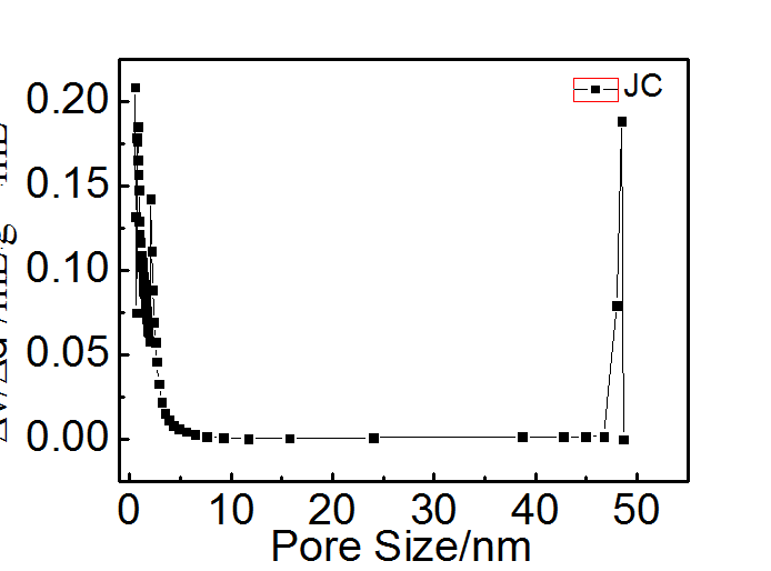 做了活性炭的BET测试,用BJH的孔径和微分孔体积做了孔径分布图,发现微孔居多,但在最后接近50nm处出现了一个峰值,不知道为什么会有这么高的大孔,应该不是数据处理的问题,不知道该怎么分析这个现象,请懂的大神解答一下! 72IL`HTM[$YDLQXBP[RPJCL.png |