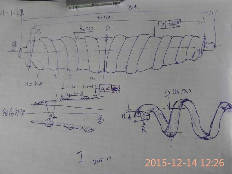 像图中的螺杆,怎么画怎么标注,才能指导加工厂的生产?我可不可以直接写结果数据,比如大径小径、螺纹n个(绕多少圈)、螺槽深度、并注明螺纹间曲面过渡,剩下的曲面半径、倾角什么的让加工厂自己找?生产这样螺杆的加工厂应该会计算的对吗?这样的螺杆好加工吗?成本多少? 还有,怎么算出一个角度所对应的弧长,需不需要标注出来,还是只标注出角度和旋转半径就可以? 发自小木虫Android客户端 |