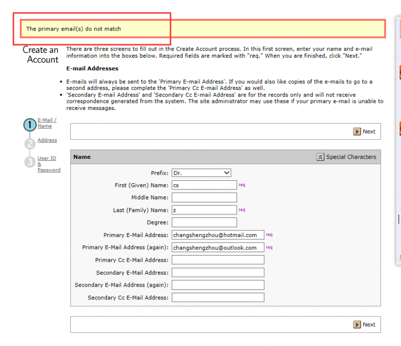 投稿SCI,注册如下图显示The primary email(s) do not match(主要电子邮件不匹配)。我换了很多的邮箱注册,换了浏览器,也换了不同的电脑,结果还是这样,我该怎样解决这个问题?这是投稿网址:https://mc.manuscriptcentral.com/jmsj 求助大神帮帮忙。 O%O}UC9UUSK_}[2%W1YYN3M.png |