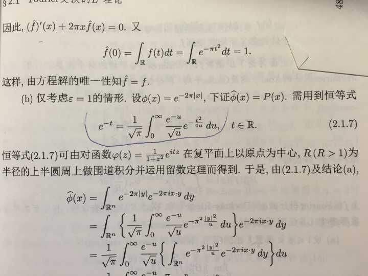 图片上是《现代分析基础(第2版)》47页的(2.1.7)式,后面的叙述里面那个函数积分只能得到π倍的(2.1.7)式左边,不知道等式右边是怎么得出来的,求大神教我 去请教了学长,现已经得到解答(′・_・`) |