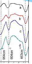 如图所示,第二个是ZrO2-SiO2,第三和第四个是添加了ZnO助剂的ZrO2-SiO2,在460cm-1和800cm-1左右的属于Si-O键的对称伸缩振动,有明显增强。这样能不能说明一点什么问题,求教! FTIR.png |