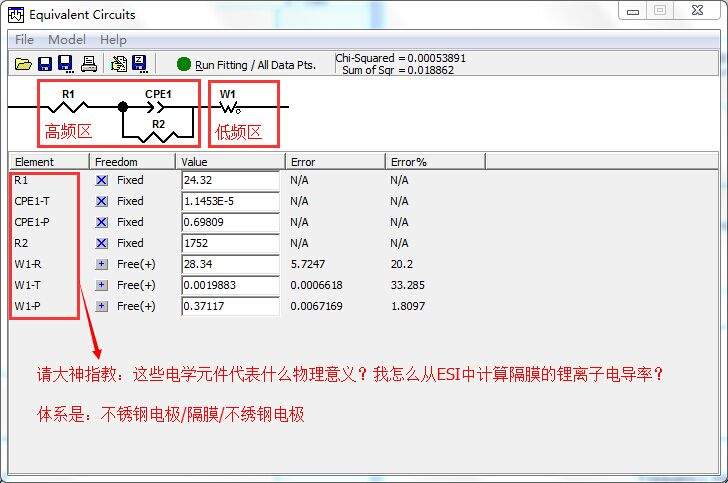 我用不绣钢对电极和隔膜组装成电池,测试了ESI。用Zview进行了拟合。拟合结果如下。请问这个拟合电路中的各个电化学元件代表什么物理意义啊?我想从ESI中计算隔膜的锂离子传导率,应该怎么计算呢?文献中有用ESI计算隔膜的锂离子传导率σ,但是基本上都是一笔带过,没有详细说怎么计算的。求大神指教![]() |