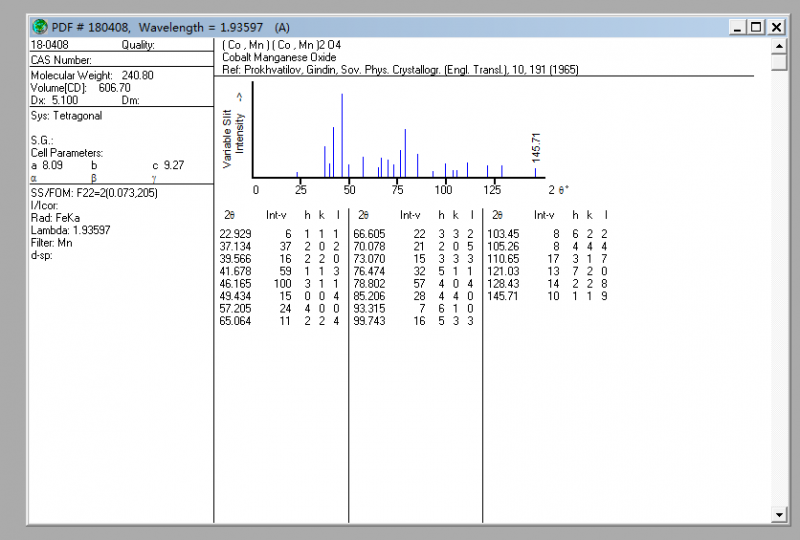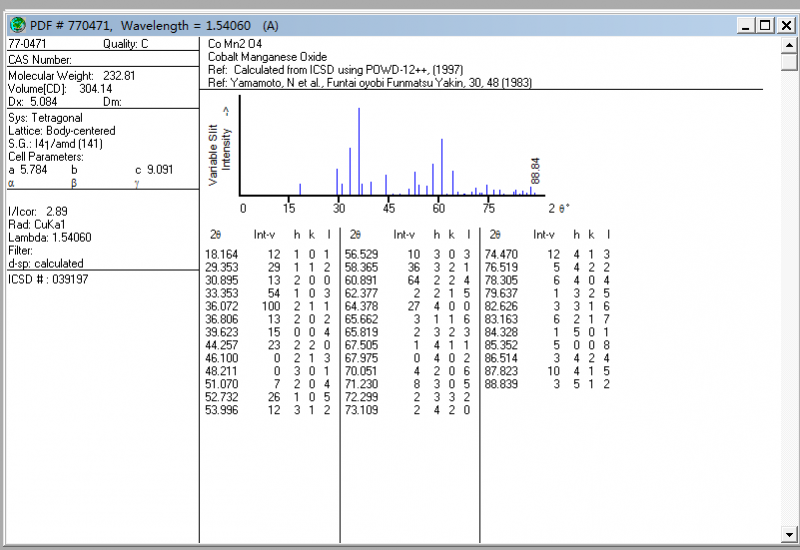 JCPDS card no. 77-0471 和JCPDS card no. 18-0408 ,有文献上说的是同一种物质,但是jade查出来,第一个是CoMn2O4,第二个是(Co,Mn)(Co,Mn)2O4,这两个是同一种物质吗