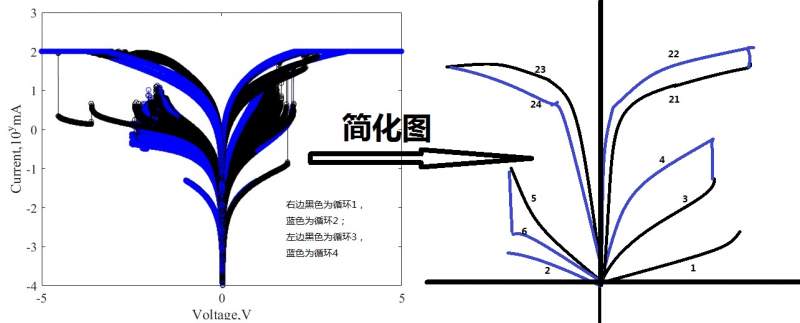 目前原因是高低阻态阻值比最大只有10倍,而且循环只有20次,最重要的是回不到高阻态了,一级一级变化。(见图片)