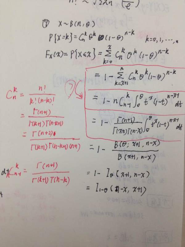 我看论文时候看到用有人用正则不完全的贝塔函数来表示二项分布的分布函数。我也从一片文章中找到了推导,见图片,但是我不太理解由箭头跳变的那一步是怎么来的。也就是从和式怎么变成积分式的。不要用做差法来证明,也不要用由二项分布构造的beta分布来说明。 cal.jpg |