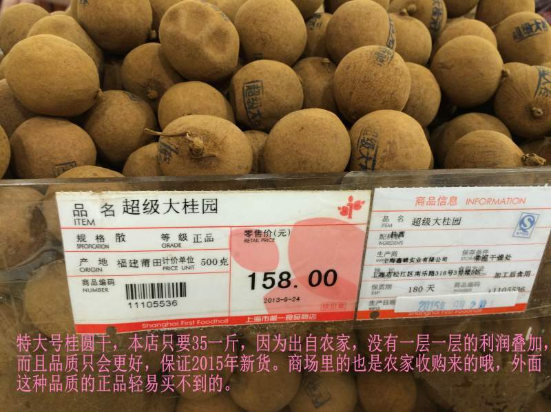 8月初看到淘宝首页广告有自称2015年新货的,我在这说,莆田龙眼还没熟呢,桂圆干怎么可能有了,这也验证了前几年批发市场老板告诉我,把去年甚至前年的货当新货卖的事实。话说回来,我这是真正莆田本地人帮爸妈卖的桂圆干,老爸的手艺不用说,手艺不好做出的桂圆干也不好的,昨儿(9.15)爸妈说桂圆干第一批上市了,今年受台风苏迪罗影响,收成大减,但是价格没变。 特大号桂圆干地址:https://item.taobao.com/item.htm?id=43633988959 大号桂圆干地址:https://item.taobao.com/item.htm?id=520390076475 中号桂圆干地址:https://item.taobao.com/item.htm?id=522053662896 小号桂圆干地址:https://item.taobao.com/item.htm?id=522942680863 去年收货好评不少,也收获了不少回头客,今年桂圆干因受台风影响,减产约2/3,但价格不变,明年是小年,桂圆干会很少哦,希望更多识货的懂养身的能够把它们收回家 老家火车站特产店里大号桂圆干450g售价68,上海南京路第一食品店的特大号桂圆干售价158一斤,有图为证: ![]() 自家都是很新鲜做的,老爸的手艺也是公认很好的,道地产地的识货,我很自信老爸做的只会比商场里卖的更好,所以真的很划算不是?![]() ![]() |
