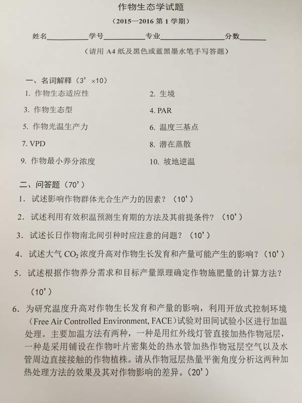 求研究生课程“作物生态学”的考试题目和答案,感激不尽呐