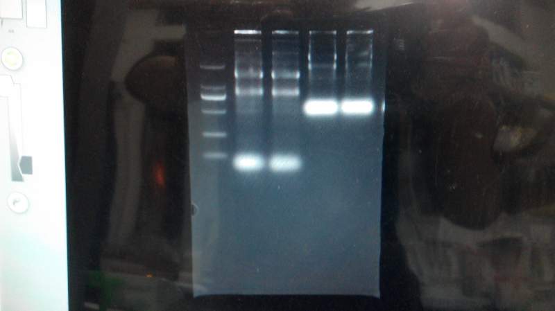 琼脂糖凝胶里相同的RNA样跑的胶,时间不一样。前面两空跑的时间长一倍,后面两孔跑的时间短。但是为什么跑的时间长(前面两孔)能看出上面两条带比较亮,跑的时间短,不能明确看出上面的两条带。谢谢! IMG_20151216_183628.jpg |