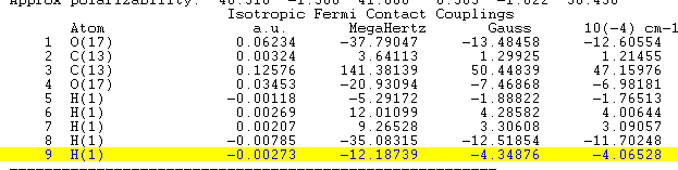 我用高斯计算乙二醇自由基的超精细常数,乙二醇结构如图。根据文献,得出的结果应该是H8>H6=H7>H9>H5.我输入文件是UB3LYP/EPR-II SCRF=(PCM,solvent=1,2-ethanediol).(乙二醇自由基已经优化过。)请问是哪里的问题? 数据.png 文献中的谱.png 分子结构.png |