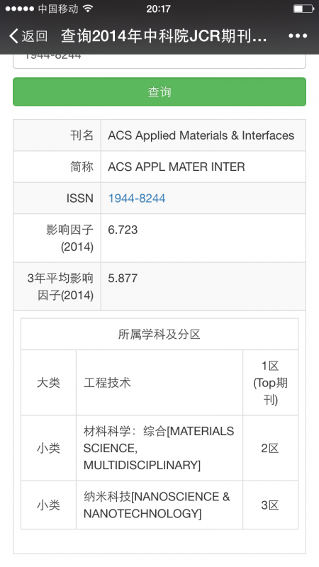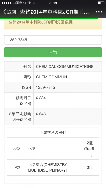 ACS APPL MATER INTER ISSN: 1944-8244 Chem Commun ISSN:1359-7345 请帮我查这两种期刊2015年的中科院JCR分区,谢谢 |