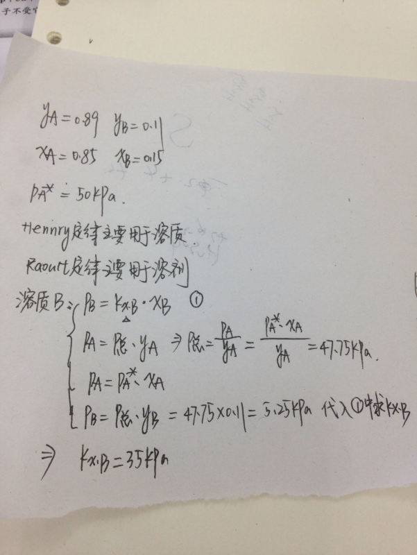 我算出来是35kpa,你可以看看书再理解理解。 Ya=Pa/P总 Pa=P标·Xa Pb=P总(1-Ya) Pb=kb`xb kb就是所求的 发自小木虫Android客户端 |