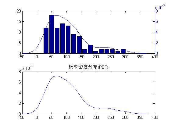 在matlab中运算后,得到附件所示的图片,曲线表示概率分布函数,直方图表示一定尺寸范围内的粒子数。