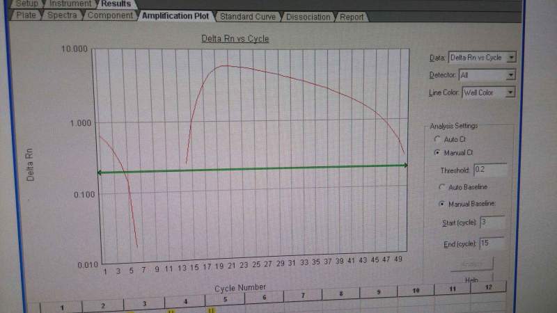 如图,红色曲线呈现明显的下降,原因是什么?另外,分析结果中的ct值是否可用,谢谢 发自小木虫Android客户端 |