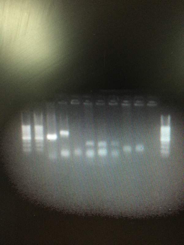 marker后1 2 孔用的是同一种引物,为什么条带位置不一样? 并且4 5 6孔可能出现两个条带都是引物二聚体吗?如果不是二聚体,条带的位置跟我的目的基因位置也不符合。7 8 两孔看起来是引物二聚体,可是9为什么没有二聚体?并且条带位置跟我的目的基因位置是符合的! 很不解,请求回答~ 每三个孔分别是阳性对照,样品,阴性对照。