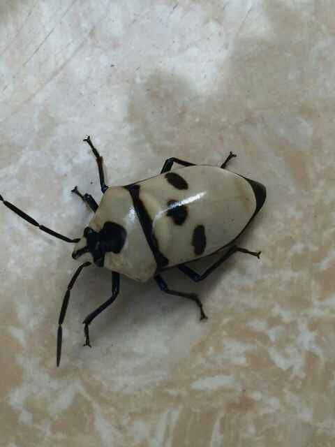 大盾背椿象 Eucorysses grandis 体长约 22 - 26 mm,体背有白色、米黄色、橙黄色等,头部中央有黑色的纵带,头部、前胸后缘具黑色的横带 ,盾背有3枚黑色大斑,各脚腿节有蓝色的金属光泽。本属一种,本种普遍分布于低、中海拔山区,成虫 4-5月出现,11-12月可见越冬的个体,曾发现于白匏子、朴树上,喜欢群居,数量很多。 http://www.shsgsw.com/html/4789322111.html |