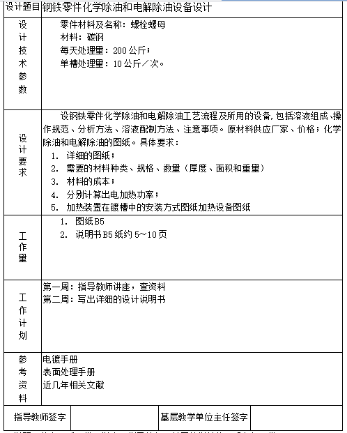 现在有一个课程设计题目:设计钢铁零件化学除油和电解除油的设备。 不知如何下手,有一些疑惑: 1,关于设备一些工艺参数和标准,我该去哪查。 2.应该从哪里入手分析。 谢谢大家,帮我分析一下。 |