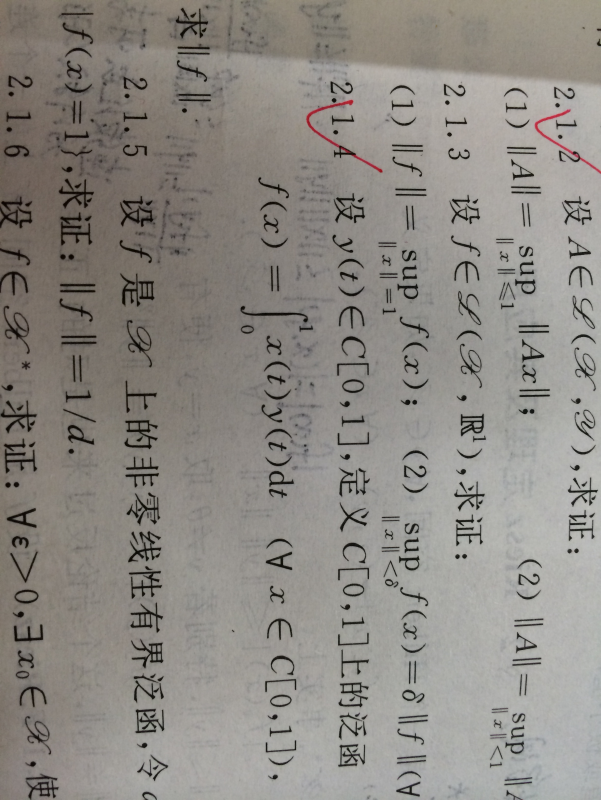 首先,根据线性泛函表达式,有 |f(x)| = |\int^1_0 x(t)y(t) dt| <= max_{t\in[0,1]}{|x(t)|}*|\int^1_0 y(x) dt| = ||x||*|\int^1_0 y(x) dt| , 另一方面,取x_0(t)=1, 则 ||x_0||=1, 此时 ||f|| = sup_{||x||<=1} ||f(x)||/||x|| >= sup_{||x||=1} ||f(x)||/||x|| =sup_{||x_0||=1} ||f(x_0)||/||x_0|| = |\int^1_0 y(t) dt| 因此,||f|| = |\int^1_0 y(t) dt| 最后需要强调的是,算子的范数与其定义的空间密切相关。这里考虑的连续函数空间上的常见极大值范数。 |
