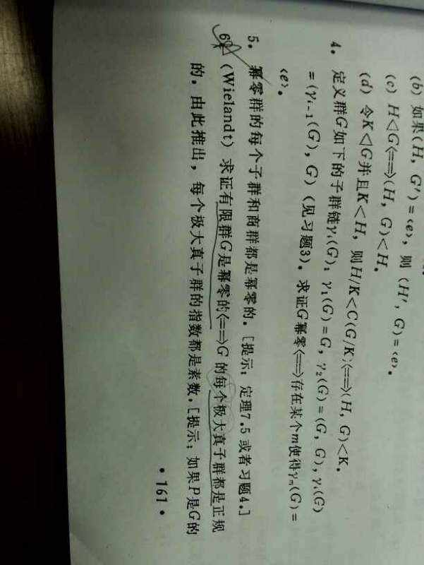 | 右推左:设P为G的一个极大真子群。则P为正规的,G/P必为循环群(如果不是循环群,取一个循环真子群<a><G/P, <a>在G中的原像包含P,与P的极大性矛盾)。为了证明G为幂零群,只需证明P为幂零群。我们证明P中的任何极大真子群也是正规的(这样归纳下去就证明了G为幂零群)。假设有一个极大真子群N<P, xNx^-1 不是N, x\inP. 设G/P=<t>, 设t在G中的一个原像为s。我们证明 <N,s> 以及<xNx^-1, xsx^-1>为G中的两个不同。任意取y \in G\<N,s>, y在G/P中的像为t^i, y=p s^i from some p\in P. 所以p \in G\<N,s>. 所以 <N, p>=P, 根据N的最大性。也就是<N,s, p>=G, <N,s>为G的极大真子群。同理可证<xNx^-1, xsx^-1>也是G的极大真子群。因为有一个元素xnx^-1不在N中,xnx^-1也不在<N,s>中(否则<N,s>=G), 也就说明了<N,s>与<xNx^-1, xsx^-1>不相同,矛盾。 |