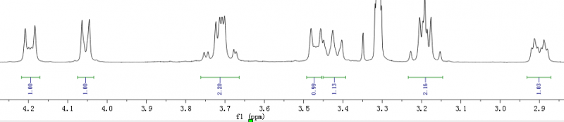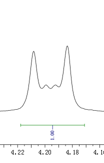 请教各位大牛4.20ppm和3.46ppm两个相互耦合质子的峰型,以及产生此种峰型的原因。第二个图片是4.20ppm放大图。 0X_[[_KWQEE5K}CYS{$IWR7.png P4C$Q20]7[KCWRQ@TZD4LZW.png |