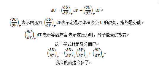 等压下,U对t的偏导 等于 等容下u对t的偏导,加上等温下u对v的偏导乘以等压下v对t的偏导。 该式物理意义是啥。(不会发图啊)求助 |