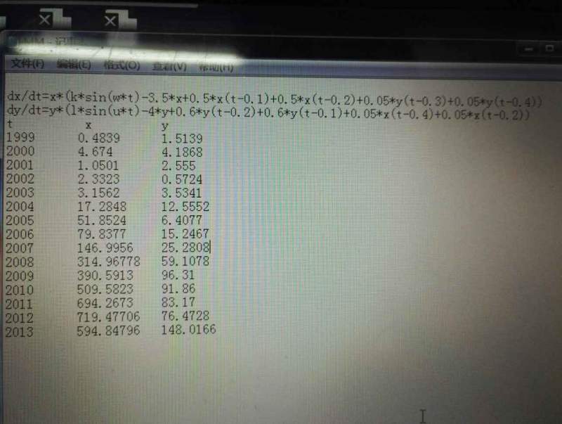 dx/dt=x*(k*sin(w*t)-3.5*x+0.5*x(t-0.1)+0.5*x(t-0.2)+0.05*y(t-0.3)+0.05*y(t-0.4)) dy/dt=y*(l*sin(u*t)-4*y+0.6*y(t-0.2)+0.6*y(t-0.1)+0.05*x(t-0.4)+0.05*x(t-0.2)) t x y 1999 0.4839 1.5139 2000 4.674 4.1868 2001 1.0501 2.555 2002 2.3323 0.5724 2003 3.1562 3.5341 2004 17.2848 12.5552 2005 51.8524 6.4077 2006 79.8377 15.2467 2007 146.9956 25.2808 2008 314.96778 59.1078 2009 390.5913 96.31 2010 509.5823 91.86 2011 694.2673 83.17 2012 719.47706 76.4728 发自小木虫Android客户端 |
